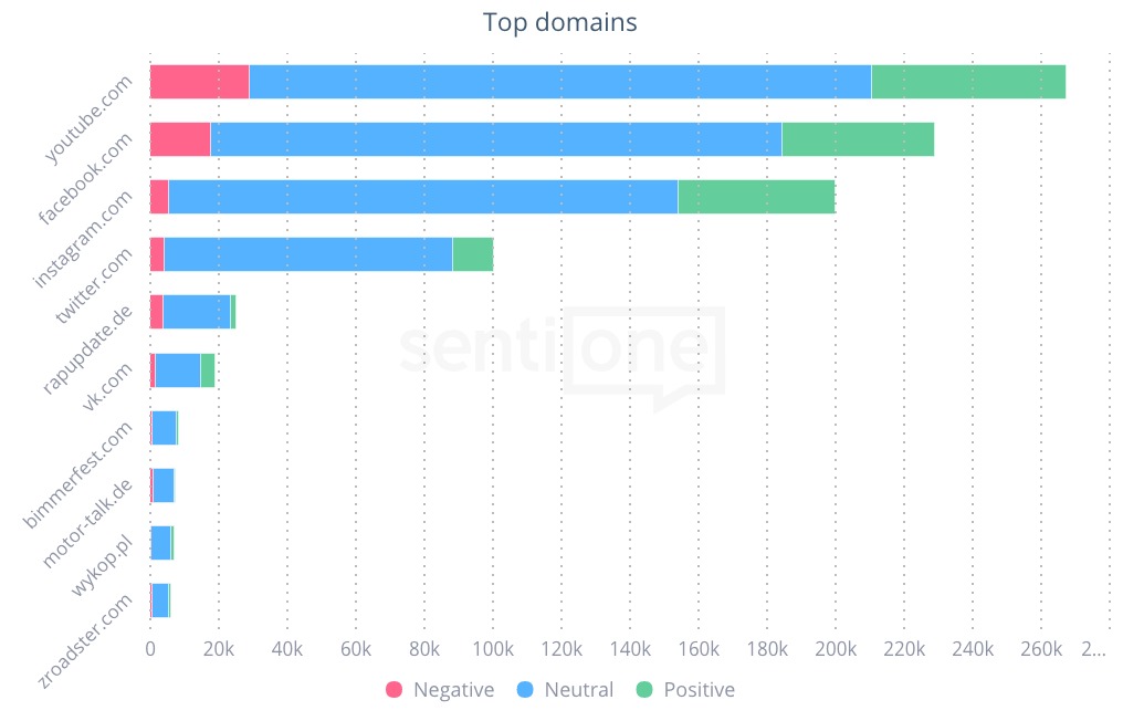 Just by looking at the chart above, we can see that Youtube, Facebook, Instagram, and Twitter are the most popular channels. But there are also other sources that generate significant activity – in this case, BMW was often mentioned on such sites as VK.com, Motor-Talk.de, rapupdate.de.