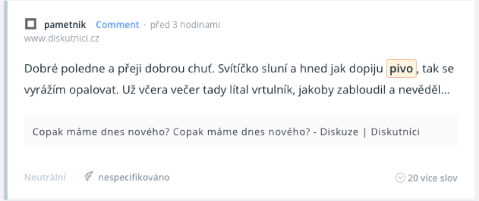 Stejně tak jako graduje postupně káva, nemůžeme opomenout náš český národní nápoj, náš tekutý chléb náš zlatý mok – pivo! Zajímavostí je, že slovo pivo Češi zmiňují v průběhu týdne každý všední den naprosto nejvíce, kdy pátek je dnem, který stupňování konverzace vrcholí. Ale o víkendu jeho zmiňování razantně klesne. Očividně je v České republice pivo zejména popracovní záležitostí.