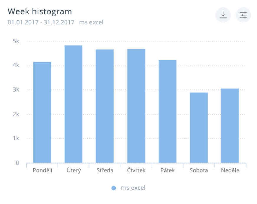 V úterý a ve středu jsme už v plném pracovním nasazení, vyplňujeme tabulky, kontrolujeme čísla.. A to nám dokazuje i fakt, že v tyto dny zmiňujeme MS Excel mnohem častěji nežli v jiné dny v týdnu.