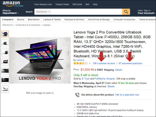 A i když jsou názory uživatelů na stránce Amazon uvedené záměrně malým písmem (viz. screenshot), klikne právě na tyto odkazy až 89% zájemců, a to i v situaci (!), že si daný produkt vybrali už předem. Čtením zákaznických recenzí stráví zájemci o dané zboží navíc většinu času věnovaného prohlížením informací. Uživatelské recenze přitom Amazon přímo neovládá – jako takové jsou totiž součásti široce pojatých sociálních sítí.