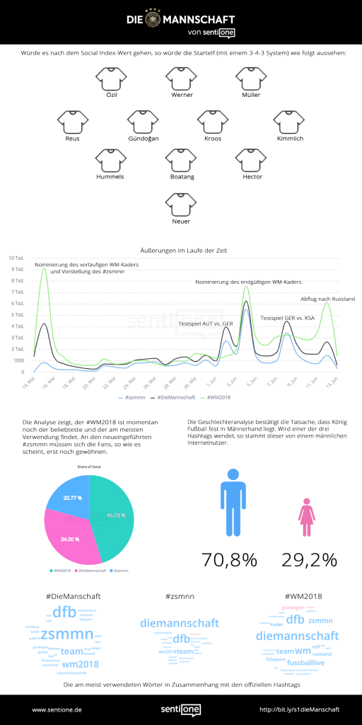 Heute beginnt in Russland die Fußballweltmeisterschaft. Als Titelverteidiger geht die deutsche Nationalelf, auch „Die Mannschaft” genannt, ins Rennen. Am Sonntag startet dann die Elf von Bundestrainer Jogi Löw in ihr erstes Vorrundenspiel gegen Mexiko. SentiOne hat sich einmal die Online-Diskussionen rund um die deutsche Mannschaft angesehen und in einem Bericht zusammengefasst. Ziel ist es, einen Einblick über die Meinung der Internetnutzer über die deutsche Fußballnationalmannschaft („Die Mannschaft“), die Spieler und den Buzz rund um das DFB-Team zu bekommen. Der komplette Bericht ist unter http://bit.ly/s1dieManschaft abrufbar.