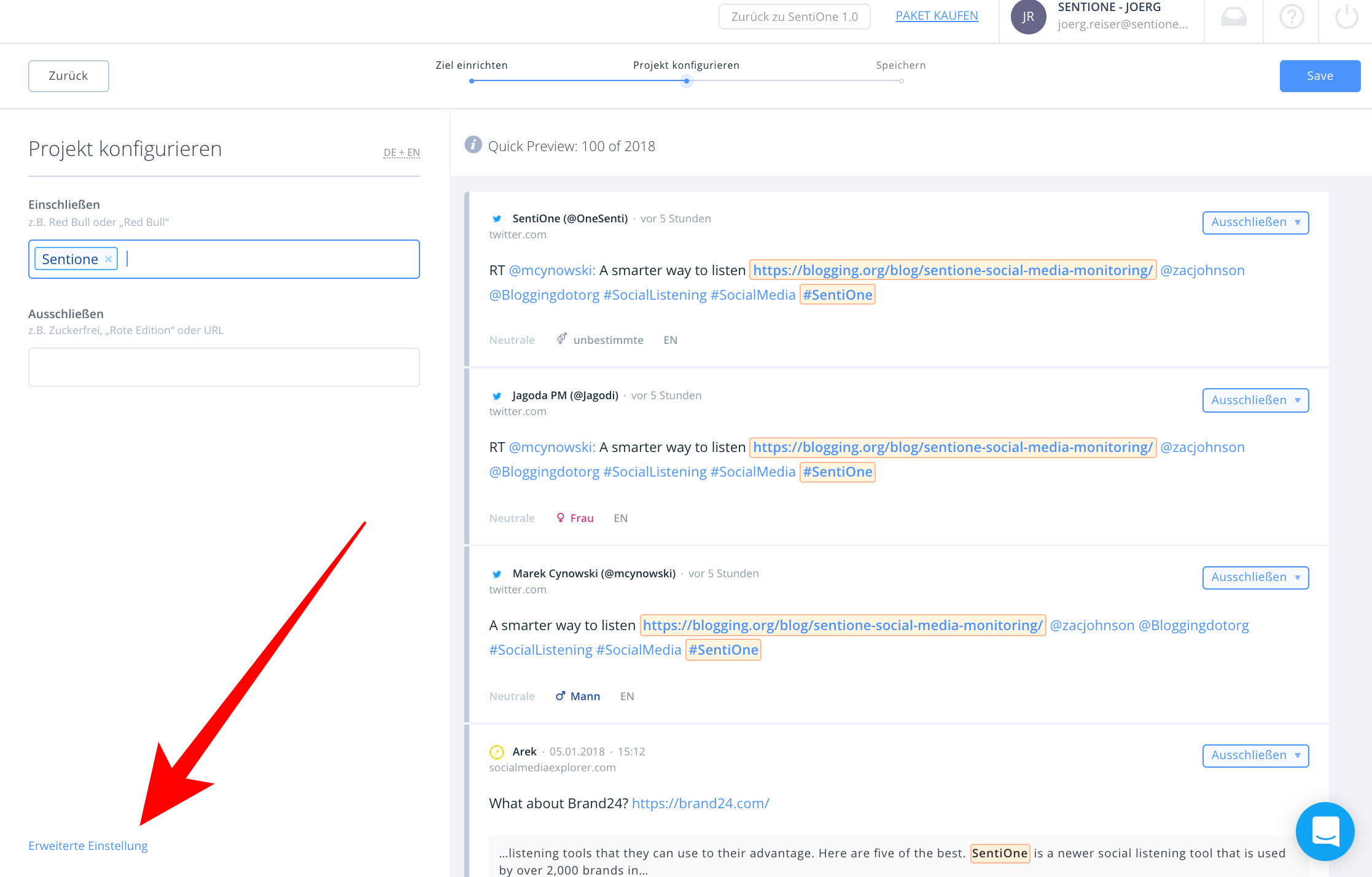 2. Bei SentiOne hat man jetzt die Möglichkeit ganz einfach zwischen den Projekten zu wechseln. Denn gerade am Anfang muss man sich mit einem neuen Tool erst vertraut machen. Wenn man aber tiefer in die Materie eindringt, dann hat man einen besseren Einblick und nutzt auch die erweiterte Sucheinstellung.