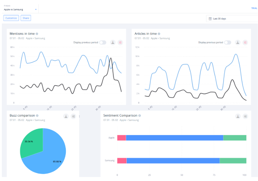 This way, you can keep tabs on your entire industry — and if a given entity suddenly jumps in mentions, you can easily switch to its bespoke analysis to probe the matter further.