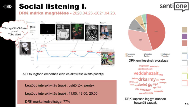 Ahogy az ábrán látható májusban a 25 %-os kedvezmény illetve az anyák napja volt a legsikeresebb, júniusban a black lives matters poszt – “Nincsen rossz vallás. Nincsen rossz bőrszín. Csak rossz emberek vannak.” Novemberi hónapban a legnagyobb aktivitást a halottak napi megemlékező poszt, illetve a dzsungel pulcsik mutatták. A februári hónapban az AWS frontemberének szomorú halála miatti poszt váltotta ki az emberekből a legnagyobb aktivitást. A márciusi hónapban pedig a DRK Fame és Ultralight cipők posztjai voltak a legsikeresebbek. 2 Az Ultralight termékcsaládot a későbbiekben részletesebben vizsgáljuk. A DRK említéseinek 44.97 %-a a Facebookon történik, 32,93 %-a honlapokon és 10,79 %-a az Instagramon. A DRK-val kapcsolatban a legtöbb interaktivitás csütörtökön és pénteken érkezett. Délelőtt 11:00 és este 18:00, 20:00-kor a voltak a legaktívabbak az emberek. A nemek megoszlása tekintetében igen érdekes, hogy az online interakcióba lépő felhasználók 85,87 %- a férfi és csak 14,13 %-a nő. A DRK márkával kapcsolatban a leggyakrabban említett szavak a következők voltak: veddahazait, drkarmy, magyar, cipő, zene, ultralight stb. A hashtagekkel kapcsolatban is a hazai említés volt a leginkább felkapott, hiszen a #dorko után a #véddahazait, #drkarmy, #ajandekozzhazait hashtageket használták a legtöbben. A DRK márkát az általunk mért időszakban 77 %-ban kedvelték a közösségi térben.