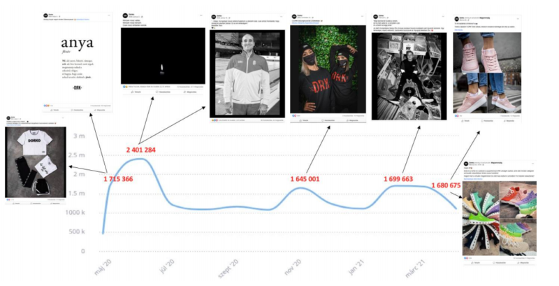 A közösségi oldalak elemzésére, összehasonlítására a SentiOne online listening weboldalt használtunk, amely figyeli, indexálja és elemzi az internetes fórumokon, blogokon, weboldalakon és közösségi média csatornákon közzétett publikus szöveges tartalmakat. Egy éves intervallumban (2020.04.23.-2021.04.23.) figyeltük meg a DRK márkát. Az elmúlt évben öt hónapban nagyobb kiugrást láttunk az elérések számát tekintve. A következőkben ezeket mutatjuk be, hogy mely posztok váltották ki a legnagyobb aktivitást az online térben (ld. 1. ábra). Pirossal jelölt számok az adott hónapban elért emberek számát jelentik.