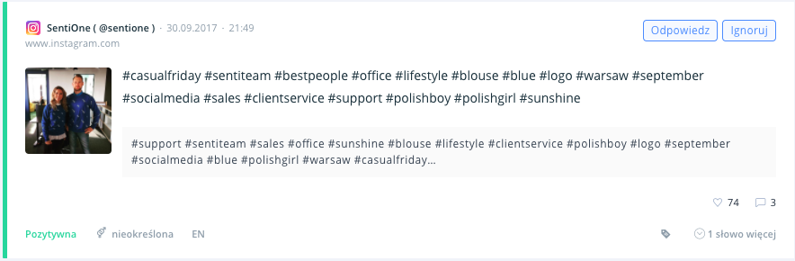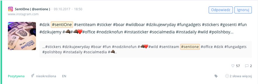 A SentiOne a Facebook posztok esetében ugyanakkor nem csupán a bejegyzések érzelmi hátterét ismeri fel, de a szerző nemét is (nagy előny: célcsoportképzés). Emellett regisztrálja az elérés nagyságát, a megosztások és kommentek számát, valamint mostantól értelmezi a szimbólumalapú reakciók (emojik) jelentését is.