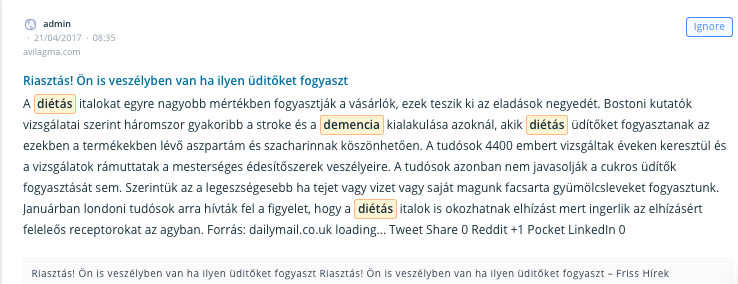 És, mi van akkor, ha kezdetben még nem említik a márkádat, de számodra nézve veszélyes vizekre evez az internet? Idén áprilisban a vilagma.com kamu-gyanús portál például lehozott egy cikket, miszerint a diétás üdítők háromszorosára növelik a demencia, az agyvérzés esélyét. Azóta ez azoldal már nem elérhető. Helyette a vilagtitkai.com működik… Az eredeti cikk az eredeti domain címen így nézett ki: