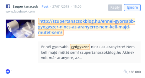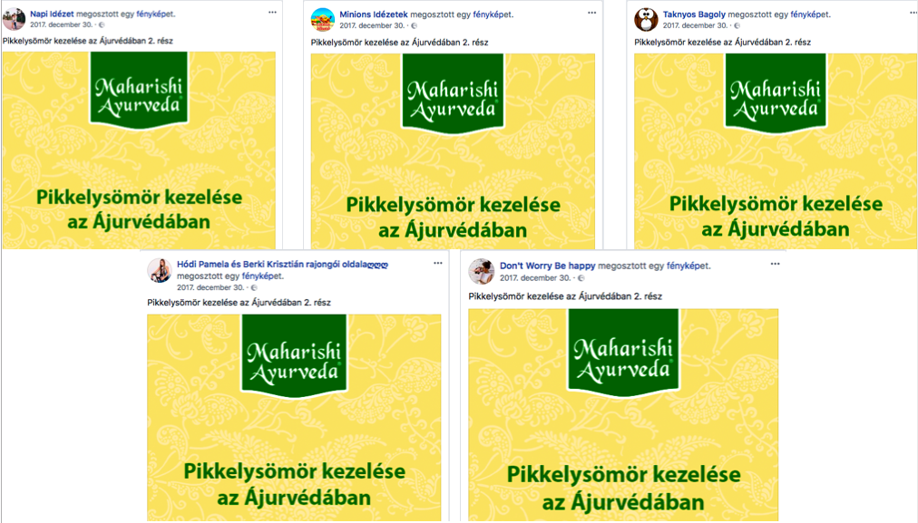 Ráadásul a vényköteles gyógyszerek közösségi média jelenlétét meghatározó ‘fake news’, tartalommutáló ‘oldal-konglumerátumok’ masszív csoportja ebben a kontextusban is jelen van. Az Ajurveda kezelését például alapvetően csak az oldal 900 körüli oldalkedvelője láthatta, épp ezért a posztot továbbdobták több százezres (vásárolt?) követőbázissal rendelkező oldalakra is, mint például (a teljesség igénye nélkül):