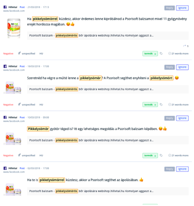Az Eventuspharma webshop, a Szeretem a bőröd Facebook oldal, a Psorioderm hivatalos oldala és a Derma Art Bőrgyógyászati Klinika például mind egy – valószínűsíthetőleg saját – és recept nélkül is kapható termék mögött áll, több saját platformot is becsatornázva a reklámtevékenység mögé.