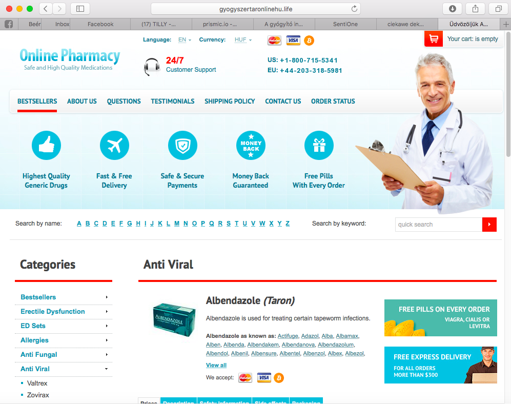 A gyogyszertar-hu.life vagy épp a gyogyszertaronlinehu.life bizalomgerjesztő domain címei alatt egyrészt találunk egy rakat bestseller terméket (gyógyszert). Másrészt egy angol nyelvű oldalt (ami amúgy egyáltalán nem érhető el magyarul, a nyelvek opcióra kattintva SEM.)