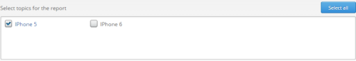 Then you choose the topics you want to have included in the report. Topics chosen in this section will not be compared, but shown as two separate summaries. If you would have chosen “iPhone 5″ as your main topic and then chosen “iPhone 5″ and “iPhone 6″ in the “Select topics for the report” box, data for “iPhone 5″ topic will be shown twice.