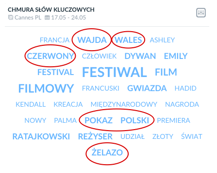 Co ciekawe, polskojęzyczne wzmianki o festiwalu pojawiają się w innych źródłach i w innym kontekście niż ich angielskie odpowiedniki. W chmurze słów kluczowych pojawiają się oczywiście “czerwony” i “dywan”. Znalazło się tam jednak dużo miejsca dla fraz “Wajda”, “Wałęsa”, “Człowiek”, “Żelazo”. To efekt wizyty byłego prezydenta na specjalnym pokazie filmu “Człowiek z Żelaza”, w ramach cyklu Cannes Classics.