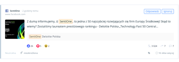 W SentiOne, posty z Facebooka analizowane są pod kątem nacechowania emocjonalnego wypowiedzi (wydźwięk), płci autora, zasięgu, udostępnień, liczby komentarzy, a od teraz także reakcji takich, jak: