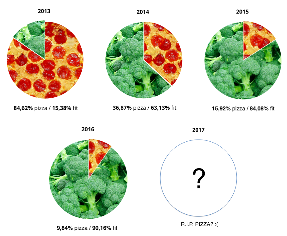 To jednak dopiero początek. Pozostając przy aplikacji dla fotografów-amatorów – znacie pewnie hashtag #instafood? Oczywiście, że znacie. W takim razie sprawdźmy, co pojawiało się w jego kontekście wczoraj i dziś. Porównajmy wszystkie wpisy, w których obecny był #instafood, jednak – żeby było ciekawiej – tylko wtedy, gdy obok wpisany został jeden z dwóch dodatkowych: #fit i #pizza. Jak myślicie, który trend był popularniejszy kilka lat temu, a który wygrywa aktualnie? Chyba nietrudno się domyślić. Oto zestawienie dla kilku ostatnich lat: