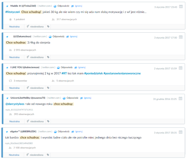 Takie wpisy to kopalnia leadów sprzedażowych dla sklepów ze zdrową żywnością, ale także pole do dyskusji i budowania autorytetu przez fit blogerów i trenerów personalnych. Tym ostatnim szczególnie polecamy monitoring internetu pod kątem postanowień noworocznych. Jak się okazuje, Sylwester mógłby być pracowitym czasem dla rzeszy z nich, zwłaszcza tych, którzy narzekają na brak podopiecznych. Wystarczy tylko odpowiednio przygotować się do rozmowy i zaangażować w dyskusje ;).