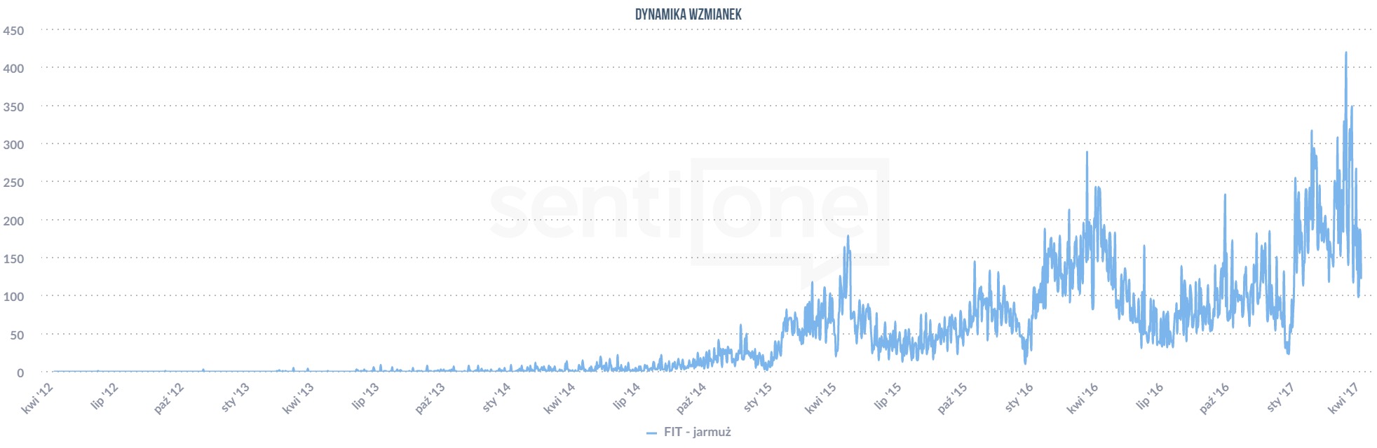 Jarmuż – dynamika wzmianek na Instagramie. Widok wykresu z SentiOne.