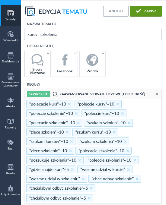 W sekcji “Tematy” dodałem wszystkie frazy, których moim zdaniem mogą używać internauci szukający szkoleń. ~10 oznacza, że słowa pomiędzy “ “ może dzielić dziesięć wyrazów – dzięki temu na przykład, jeśli internauta użył w swoim wpisie “….szukam niedrogiego, ale naprawdę dobrego i sprawdzonego szkolenia…..” – system to wyłapie.