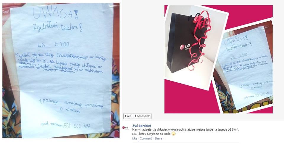 W Poznaniu pojawiło się ogłoszenie 10-latki, która zgubiła telefon. Na apel dziewczynki z prośbą o pomoc w odszukaniu telefonu odpowiedział producent. LG zapowiedziało, że prześle 10-latce nowy telefon. Doskonała promocja, szybka reakcja.