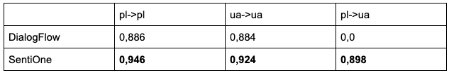 Badanie miało na celu porównanie skuteczności rozwiązań w każdej z trzech konfiguracji. Do porównania wykorzystano prototyp wielojęzycznego polsko-ukraińskiego modelu zbudowanego przez SentiOne oraz wiodące istniejące rozwiązanie DialogFlow od Google. Wykorzystano miarę f1. Wyniki testu są podane w tabeli nr 1.