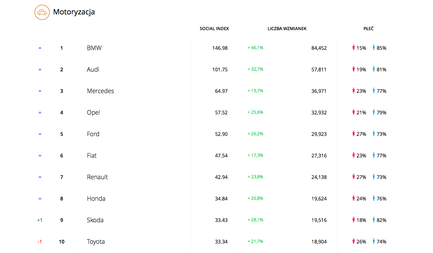 Pozostając przy tematach, o których najczęściej dyskutują panowie – w styczniu cała branża motoryzacyjna na zielono! Skąd taki wzrost popularności akurat wśród marek samochodów? Możemy zgadywać, że to wypadkowa noworocznych planów zmiany pojazdu i dopasowanych do nich przez producentów wyprzedaży rocznika 2017.