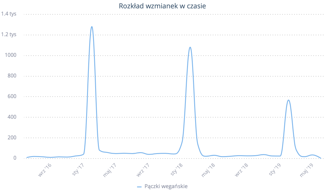 Na wstępie przeanalizowałam, jaka jest liczba wszystkich deklaracji, które zamknąć można w słowach “przechodzę na weganizm” czy “rzucam mięso”. Od 2016 roku, do połowy 2019 liczba stwierdzeń tego typu w polskiej sieci publicznej to 23 462 wzmianek.