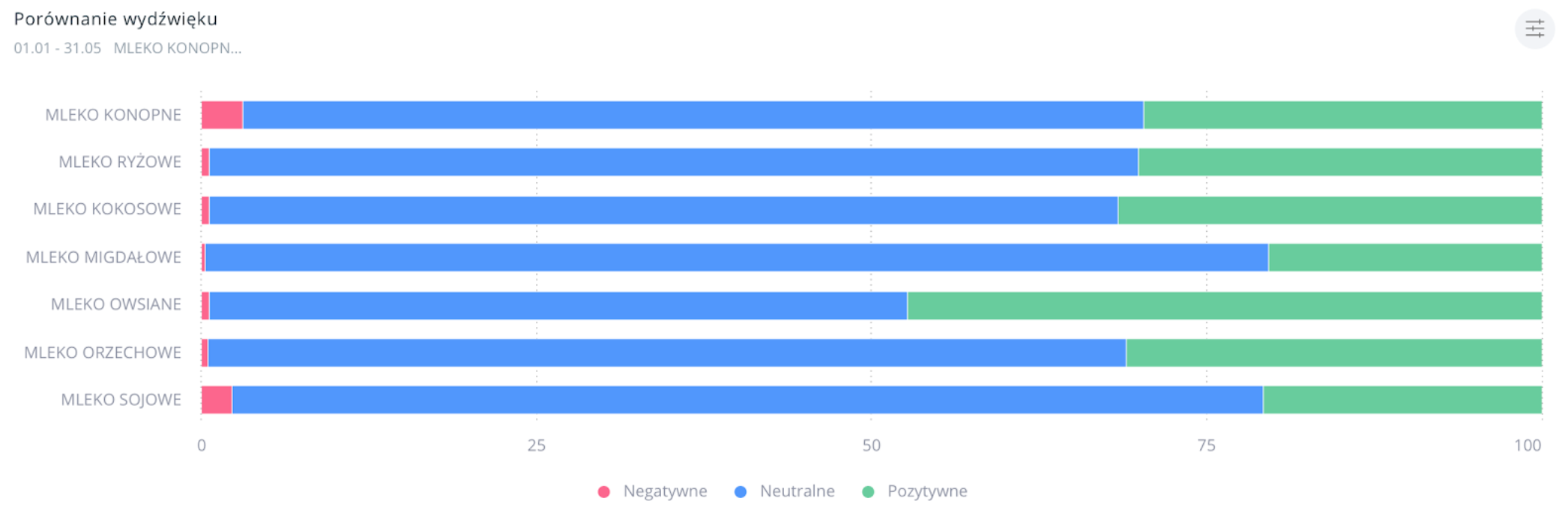 Najrzadziej wzmiankowano o mleku konopnym. Najwięcej pozytywnych wzmianek odnosiło się do mleka owsianego. Mleko konopne wzbudzało u internautów najwięcej negatywnych emocji (nieco ponad 3% wszystkich wypowiedzi o napoju).