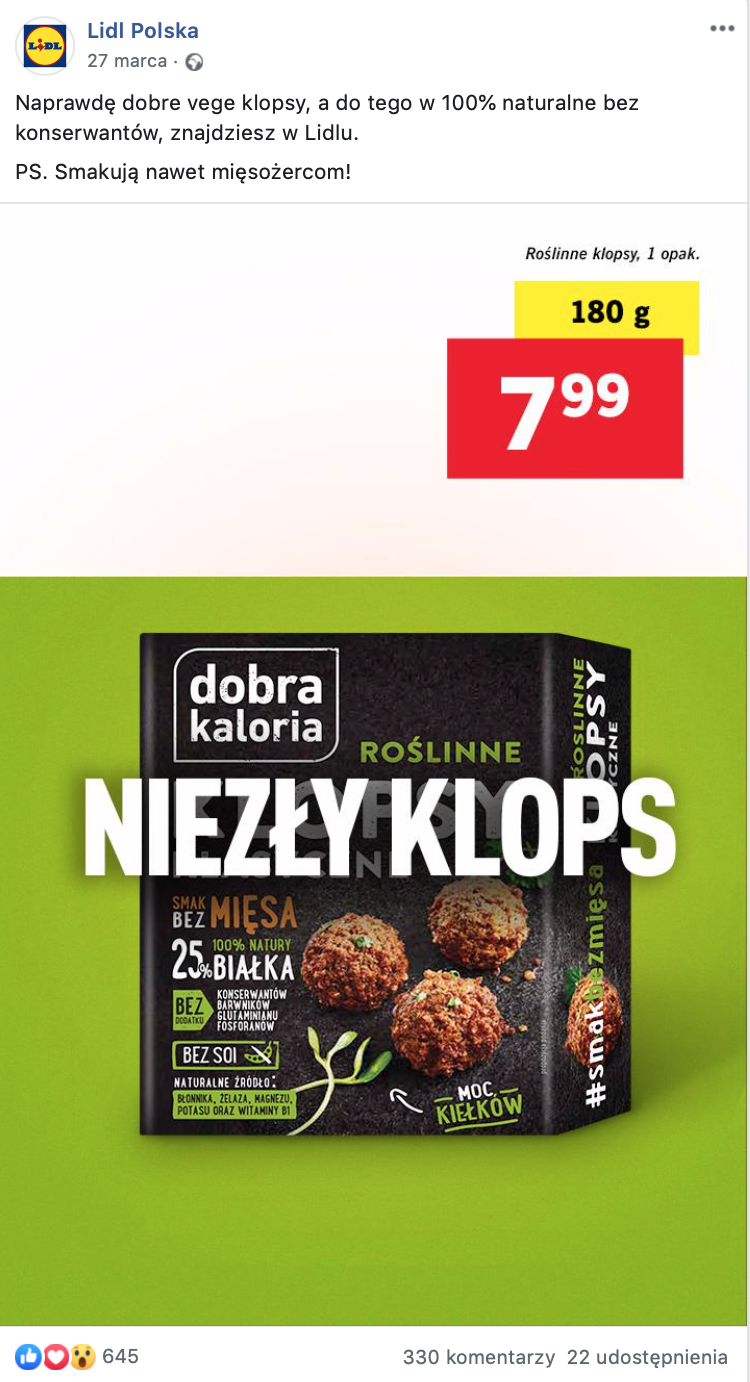 Największe natężenie dyskusji związanych z wegańskim asortymentem sklepowym miało miejsce w kontekście Lidla, 25 i 26 oraz 27 marca. Dyskusje dotyczyły promocji – tygodnia zdrowej żywności oraz specjalnej oferty produktowej sklepu. Największe poruszenie wśród internautów wywołało wprowadzenie do oferty bezmięsnych klopsów i burgerów.