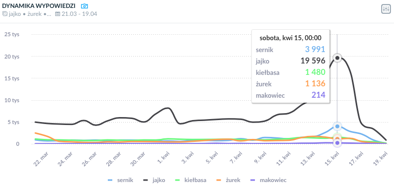 Wzrost liczby poszczególnych wzmianek w okresie Świąt Wielkanocnych. Co ciekawe, przedświąteczny pik dla słowa “jajko” związany był z planami usunięcia go z domyślnego awatara na Twitterze ?