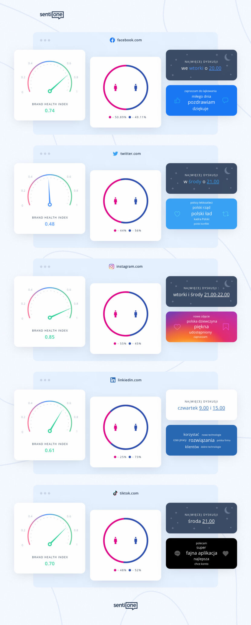 Najpopularniejszym portalem społecznościowym wśród Polaków jest Facebook, zarówno pod względem liczby wypowiedzi na nim jak i o nim. Rozmowy na jego temat mają bardzo pozytywny wydźwięk – Brand Health Index wg SentiOne, czyli stosunek dobrych komentarzy do złych, wynosi 0,74. Zazwyczaj piszemy na Facebooku we wtorki w okolicach godziny 20:00.