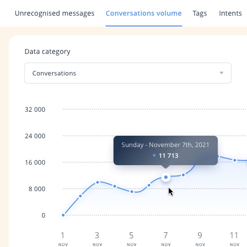 94% dokładności w rozpoznawaniu intencji rozmówcy — dzięki autorskiemu silnikowi rozumienia języka naturalnego (NLU), przeszkolonemu na ponad 30 miliardach rozmów online. Każdy bot może być trenowany na własnym zbiorze danych (rozmowy historyczne, zwroty dedykowanej dla danej branży), aby zapewnić jeszcze lepsze wyniki.