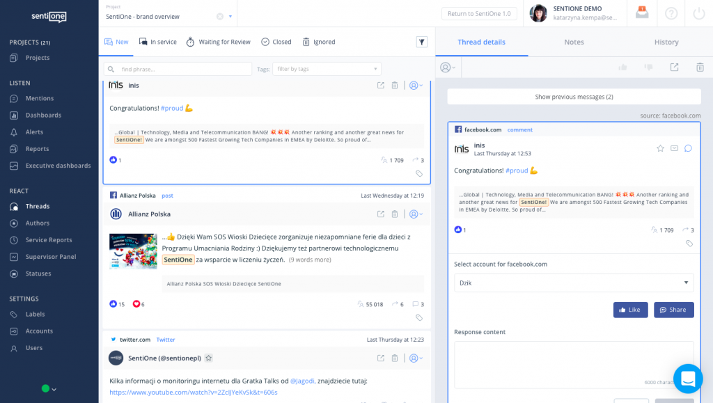 Client support should now do more than just replying to complaints, they should proactively help users, be active and available on social media too. For example, with SentiOne you get both online listening and reputation management systems. You monitor your brand name or keywords regarding your industry and use SentiOne React tool to join social media discussions. Respond to each conversation directly from one tool.