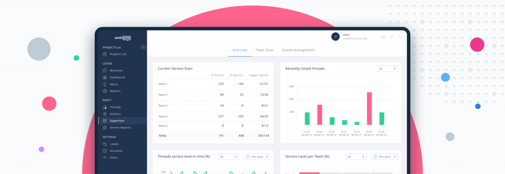 We designed the Supervisor Panel in SentiOne React to address these issues and more. Forget about trying to track dozens of KPIs across multiple projects – with a single click, you can get a complete overview of the performance of your customer service team. All of your KPIs are captured in one dashboard – with a single glance you can learn how many threads were closed, how many agents are live, what their response time is, their total servicing time and how many threads are still waiting for a reply. Do you need more? No problem – the dashboard is completely customisable. Metrics are updated in real time, so you can anticipate and address workload issues before they arise.