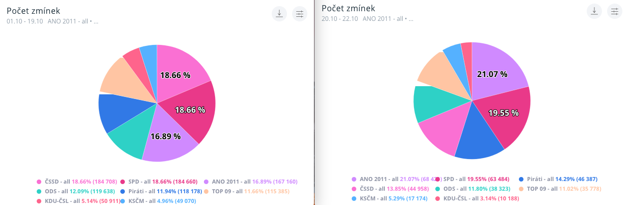 Porovnání následujících grafů nám naznačuje, o jakých stranách se hovořilo před volbami a po volbách nejvíce. Na levém grafu vidíme, že od začátku října až do voleb, získalo nejvíce zmínek ČSSD a SPD a ANO za nimi dokonce zaostávalo o 2%. Piráti byli s počtem zmínek až na pátém místě, hned za ODS. Situace po volbách se však razantně změnila a díky výsledkům se nejdiskutovanější stranou stalo ANO s 21%, dále SPD s více než 19%, poté Piráti se 14% a ČSSD se 13%.