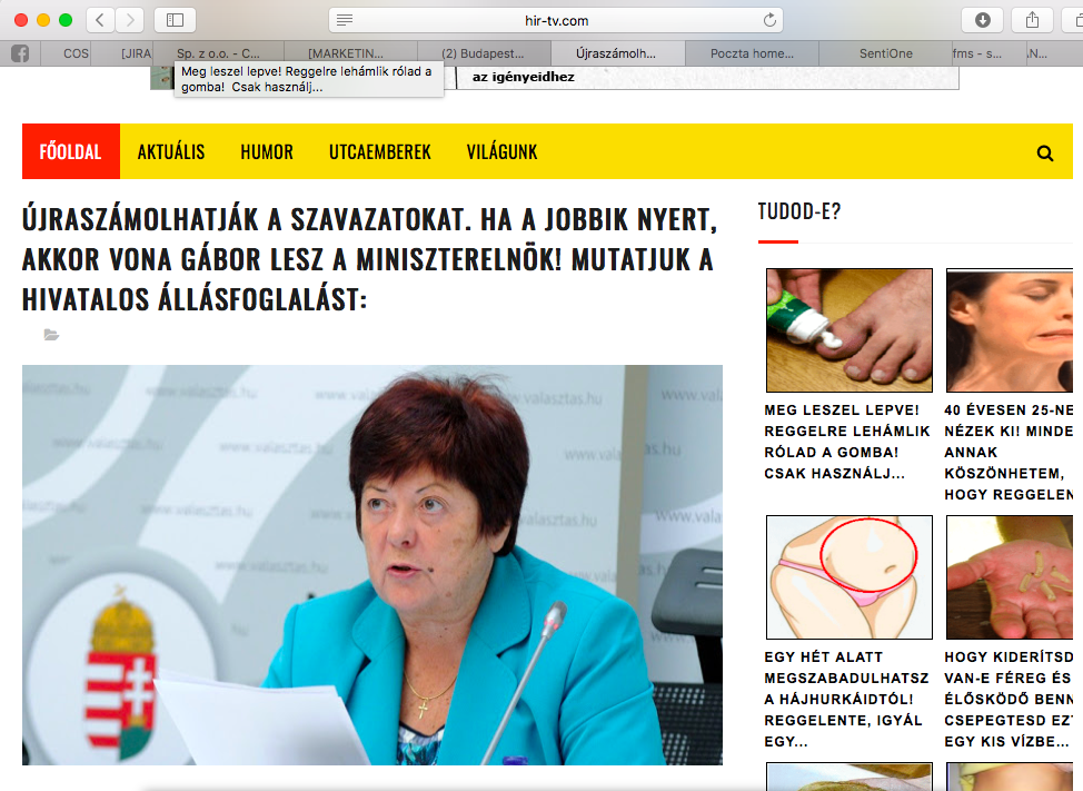 És ilyenek például azok a domain címek is, amelyek majdnem olyanok, de aztán mégsem. Például a hir-tv.com, ami változtatás nélkül továbbadta a Budapest 1873 hírét, illetve mindeközben meglepte az olvasóközönségét azzal is, hogy ‘Reggelre lehámlik rólad a gomba!’.