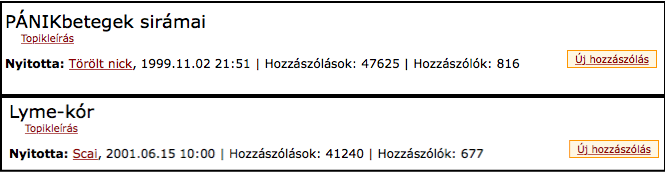 Az Indexen pedig két fórum is van, amelyek már több mint 20 éve kínálnak felületet egyrészt a pánikbetegeknek, másrészt a Lyme-kórral kapcsolatos panaszoknak, javaslatoknak. Mindkét fórum külön-külön is már több mint 40 000 egyedi bejegyzést tartalmaz.