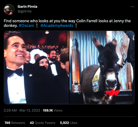 The absolute winner of the evening was ‘Everything Everywhere All at Once’, winning seven Oscars out of its 11 nominations. The second most Oscar-winning movie is ‘All Quiet On The Western Front’ with its four statues, while ‘The Banshees of Inisherin’, to the surprise of many, did not win a single award out of nine nominations. This movie inspired the event even if it didn’t receive an award. The evening’s biggest surprise and star guest was Jenny, the donkey from ‘The Banshees of Inisherin’, who was escorted onto the stage by Jimmy Kimmel at one point during the gala. Jenny has a meme-generator potential: