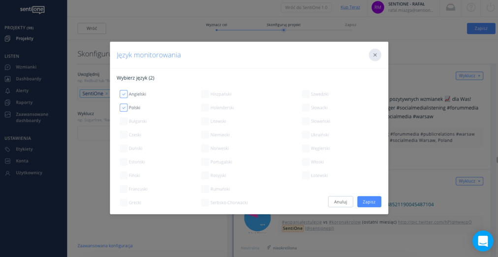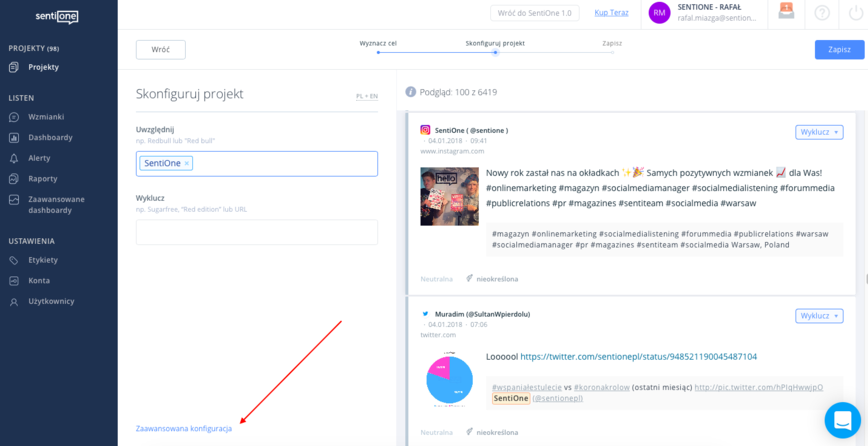Na początku przygody z monitoringiem internetu nie każdy jest zaawansowanym użytkownikiem – dlatego w SentiOne dostępne są trzy podstawowe scenariusze projektów. Z czasem jednak wielu użytkowników wchodzi na coraz wyższy poziom – aby ułatwić im zmianę już stworzonego projektu na bardziej zaawansowany, wystarczy kliknąć “Zaawansowana konfiguracja”.