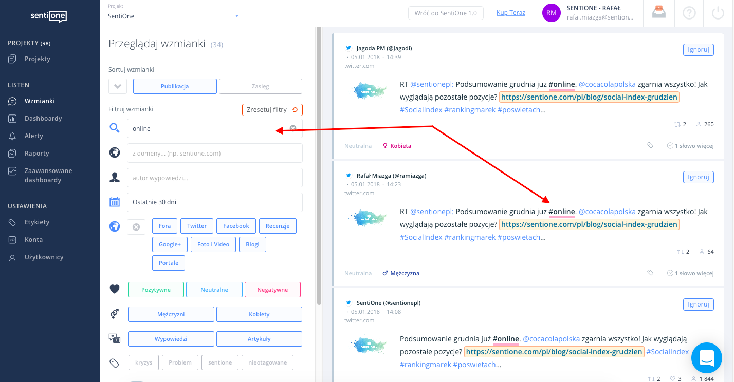 4. Usunięcie przycisku “aktualizuj wyniki” z modułu wzmianek – od teraz to po prostu jedno kliknięcie mniej – system automatycznie i w mgnieniu oka zaktualizuje wyniki po dodaniu dowolnego filtra w module “Wzmianki”.