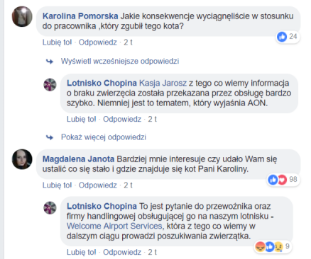 Partner Karoliny (autorki słynnego posta) wracał z dwoma kotami z Oslo. Nadał dwie kocie klatki na lotnisku wylotowym i otrzymał dwie na lotnisku przylotu. Niestety… jedna była otwarta i pusta. Minął piątek wieczór, weekend i w poniedziałek rano Karolina opublikowała post z prośbą o wywarcie presji na wszystkich możliwych podmiotach. Kota jak nie było, tak nie ma.
