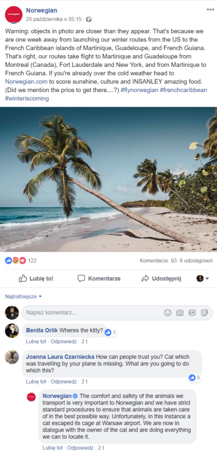 Norwegian: komfort i bezpieczeństwo zwierząt są bardzo ważne dla nas i mamy na to procedury. Niestety kot uciekł w Warszawie. Rozmawiamy i pomagamy, jak możemy.