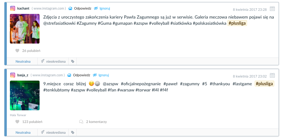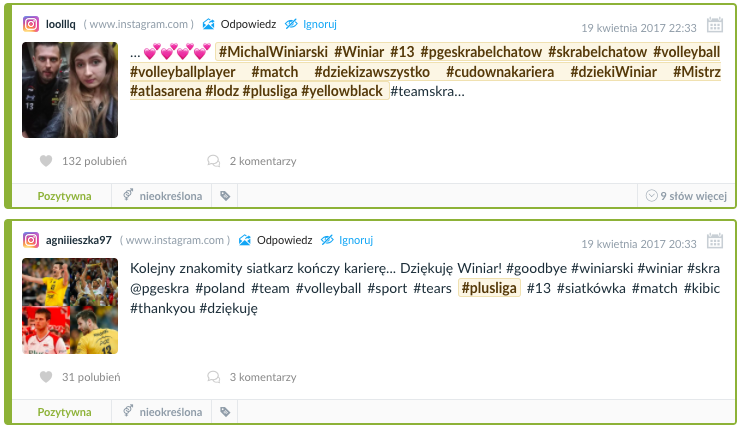 Dobry miesiąc w wykonaniu Plusa to pokłosie kończącej się w kwietniu siatkarskiej PlusLigi, której finałowe mecze wygenerowały w sieci naprawdę duży ruch. Efekt ten wzmocnił dodatkowo fakt zakończenia kariery przez dwóch wybitnych reprezentantów Polski – Pawła Zagumnego i Michała Winiarskiego. Przy zdjęciach z ich pożegnań #plusliga używany był wielokrotnie, często w pozytywnym kontekście.