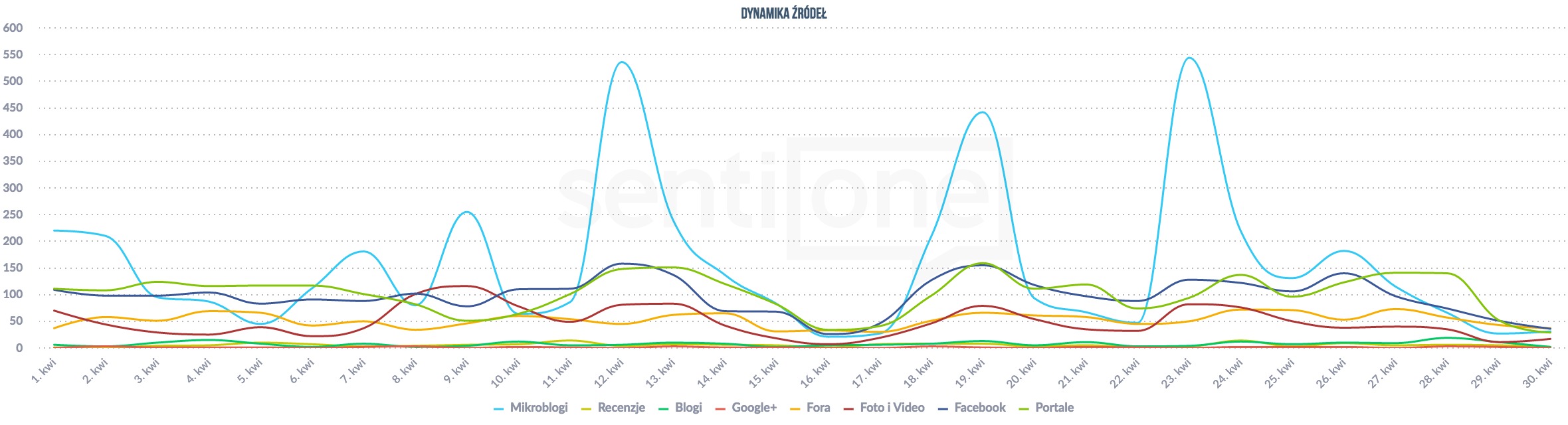 Dynamika wzmianek w czasie dla tematu Plus, w podziale na źródła. Trzy największe piki to daty spotkań półfinałowych i finałowych siatkarskiej Plus Ligi. Źródło: SentiOne.