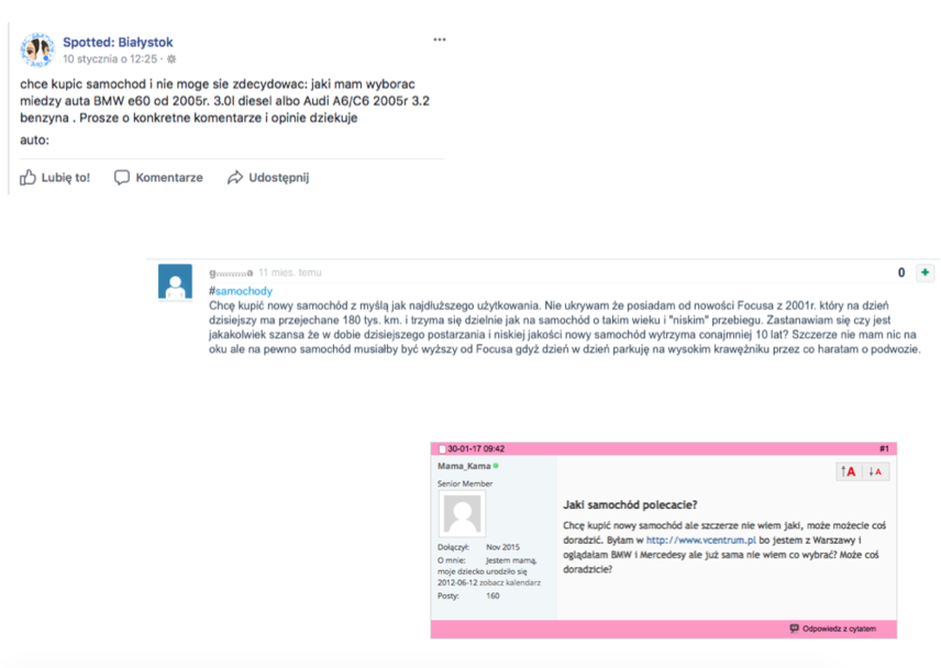 Dużo niewykorzystanego potencjału, zauważyć można na przykład w branży motoryzacyjnej. Monitorując frazę “szukam nowego samochodu”, od razu rzuca się w oczy przestrzeń w dyskusji nie wykorzystana przez sprzedawców.