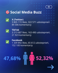 • Prawie 9,4 miliona interakcji (polubień, udostępnień, komentarzy).