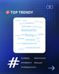 Główne tematy i hashtagi, które napędzały rozmowę, to m.in. #coldplay, #astronomer, #andybyron i #kisscam. W dyskusjach przewijały się słowa takie jak „zdrada”, „CEO”, „kochanka”, „żona” i „firma”, co dowodzi, że publiczność natychmiast połączyła prywatne życie menedżera z jego zawodową rolą i reputacją pracodawcy.