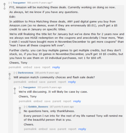 Inspiracją może być Tony, przedstawiciel firmy Amazon, który swego czasu pojawiał się na subreddicie r/GameDeals, gdzie użytkownicy udostępniali informacje o zniżkach i promocjach na gry wideo. Za każdym razem, gdy Amazon miał lepszą ofertę niż ta opublikowana, Tony wkraczał do gry. Na przykładzie poniżej, zwróć uwagę na jego podejście. Po pierwsze nie ukrywa swoich powiązań z Amazon. Po drugie, dostarcza wartości społeczności. Przecież kto nie chce jeszcze bardziej zaoszczędzić?