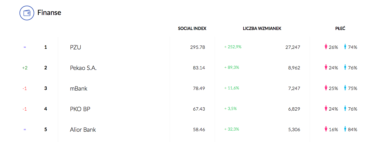 Największy wzrost zainteresowania internautów według Social Index w ubiegłym miesiącu zanotowała Cisowianka. Duże zmiany w branży finansowej – na podium rankingu wskoczył PZU, a drugim miejscem w swojej kategorii może pochwalić się Pekao SA.
